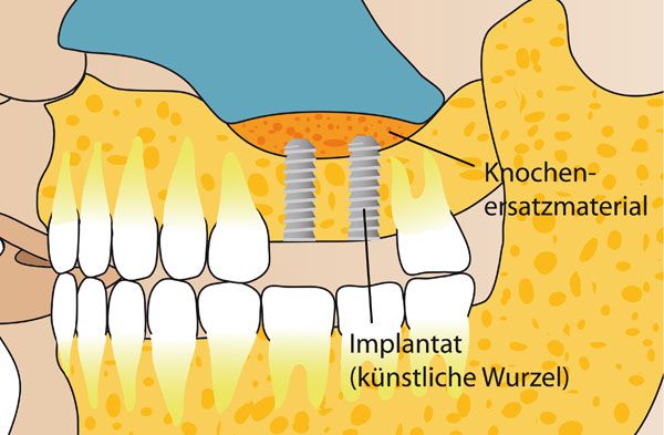 Dazu wird an der entsprechenden Stelle entweder körpereigenes Knochenmaterial des Patienten, natürliches oder synthetisch hergestelltes Ersatzmaterial eingefügt, das nach und nach durch körpereigenen Knochen ersetzt wird. Weiterhin gibt es Aufbaumethoden, bei denen der Kieferknochen des Patienten zu neuem Wachstum angeregt wird, ohne dass zusätzliches Material verwendet.